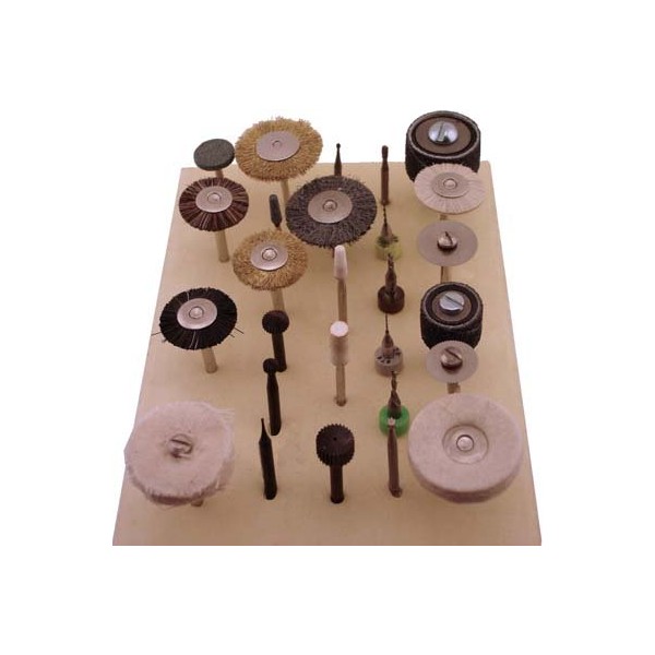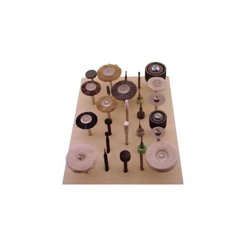 Includes an assortment of mini buffing wheels, bristle brushes, burrs, mini saws, wire wheels, sanding drums, mounted points, and rotary steel cutters.
