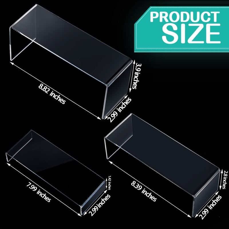 - 3 Sizes to Choose from: the clear acrylic display stand comes in 3 different sizes, including about 8.0 x 3.0 x 1.4 inches/ 20.3 x 7.6 x 3.6 cm, 8.4 x 3.0 x 2.8 inches/ 21.3 x 7.6 x 7.1 cm and 8.8 x 3.0 x 3.9 inches/ 22.4 x 7.6 x 9.9 cm in length, width and height, different sizes matching to fit your display needs, create various heights, and achieve a stunning visual presentation that will impress your customers