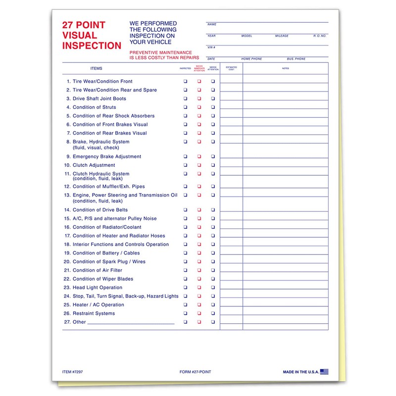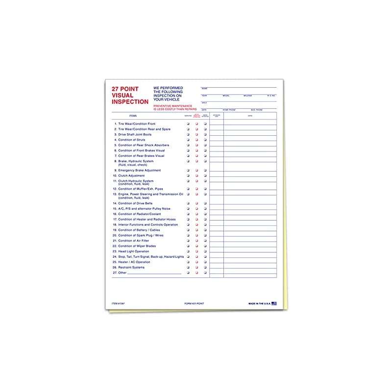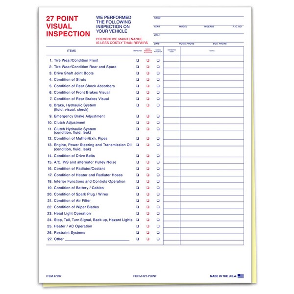 Use this 27 Point Visual Inspection sheet for customer satisfaction and additional vehicle repairs. 8.5 inches x 11 inches. 2-part, carbonless - White, Canary. Printed Blue and Red ink. Packaged 100 per pack.