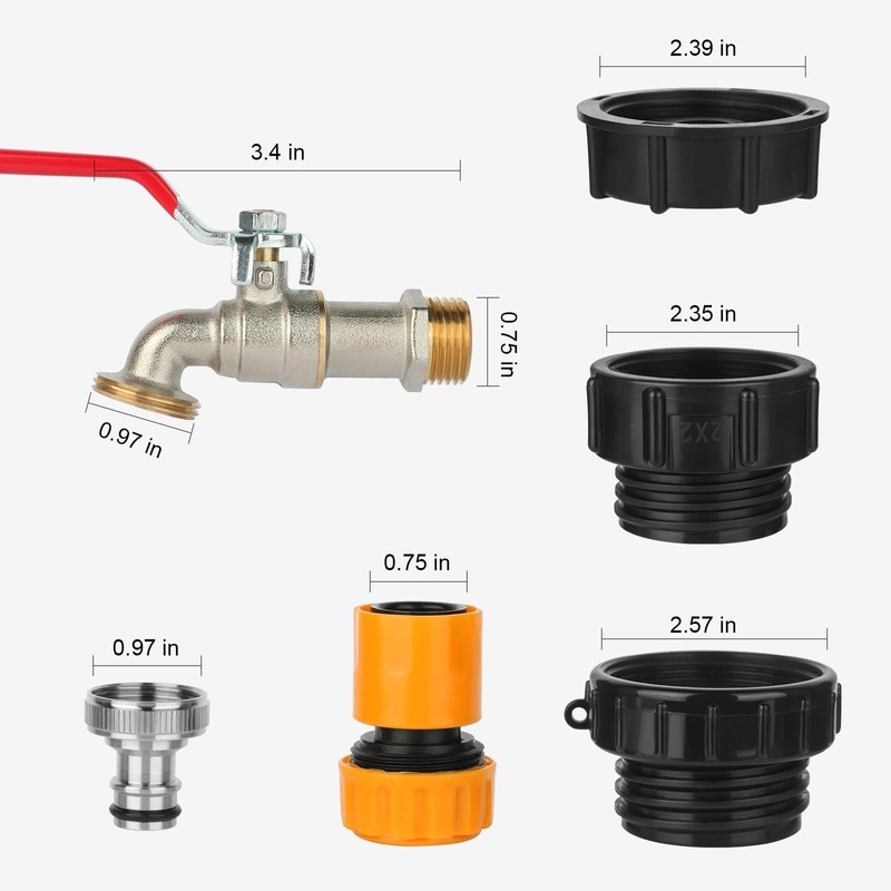 - The kit includes a 2-inch fine thread adapter, a 2-inch coarse thread adapter, a 2.44-inch fine thread IBC portable adapter, a 1/2-inch x 3/4-inch brass shutoff valve, a stainless steel spout, a quick coupling, and a roll of thread sealing tape.