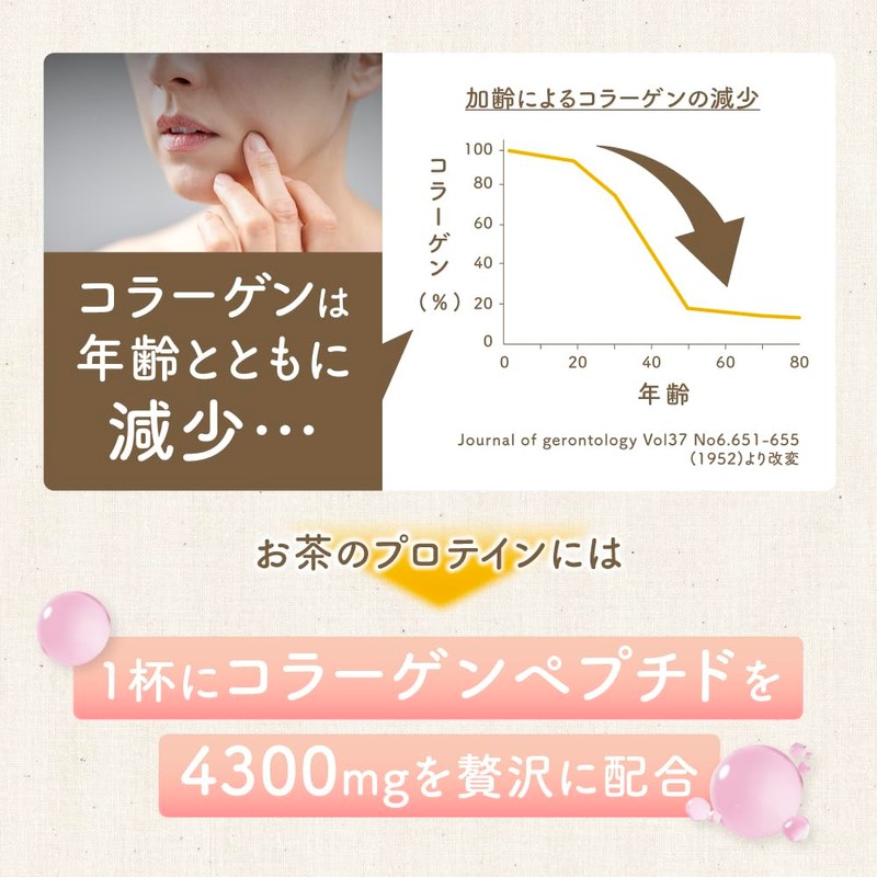 • 【🍃体の内側からしっかりとコラーゲン補給】年齢を重ねるにつれて、体内のコラーゲン量は徐々に減少していきます。実際、20代をピークに40〜50代にかけて急激に低下してしまうといわれています。そこで、お茶のプロテインは1杯あたりに4,300mgものコラーゲンペプチドを贅沢に配合。日々の「飲むだけ習慣」で、体の内側からしっかりとコラーゲン補給ができます。