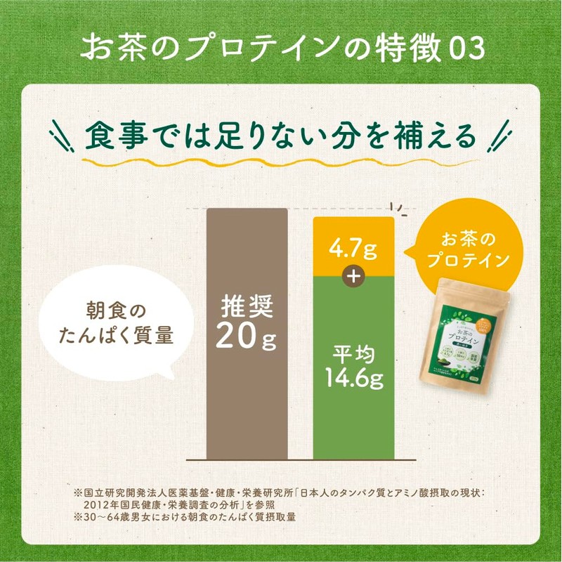 • 【🍃無糖&低カロリー】お茶のプロテインは、食事だけでは不足しがちなたんぱく質を手軽に補えるのも魅力です。 たとえば朝食では、推奨される20gに対して、平均摂取量は約14.6gしかとれていないという調査結果があります。そんなときに、お茶のプロテインを1杯プラスすることで +4.7g のたんぱく質を無理なく補うことができます。