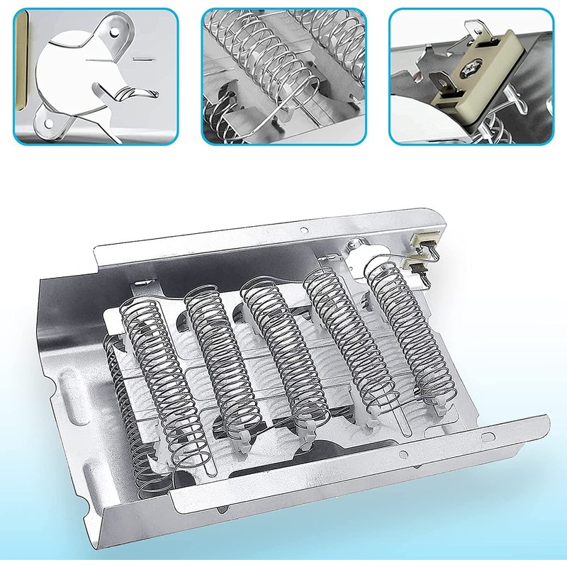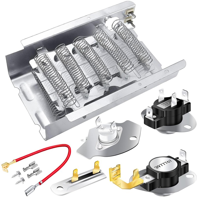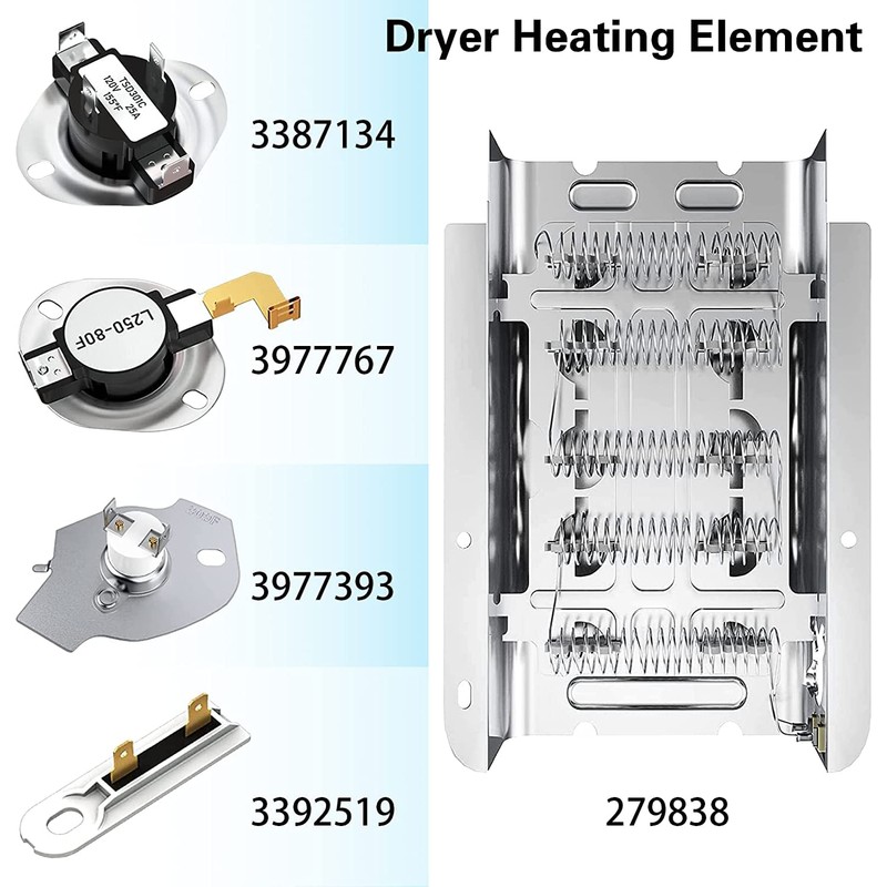 - PACKAGE INCLUDES: This dryer replacement part kit includes 1 * 279838 dryer heating element ( 5400 watt 240 volt ), 1 * WP3387134 dryer high-limit thermostat ( L155-25, opens at 155F and closes at 130F ), 1 * 3977393 dryer thermal cut-off kit, 1 * 3977767 dryer thermostat, 1 * 3392519 dryer thermal fuse, and with jumper wire terminal and screws.(Please refer to the picture for details)