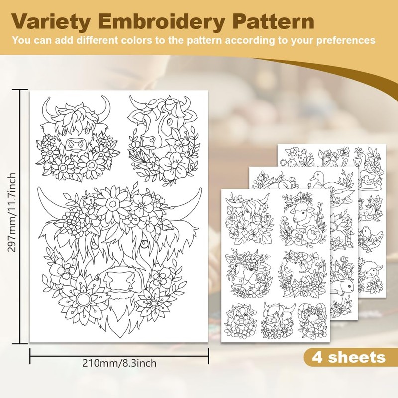 - Easy to Use: Our highland cattle and flower pre-printed embroidery patterns simplify the embroidery process, easily sewing according to the embroidery templates and friendly to embroidery beginners