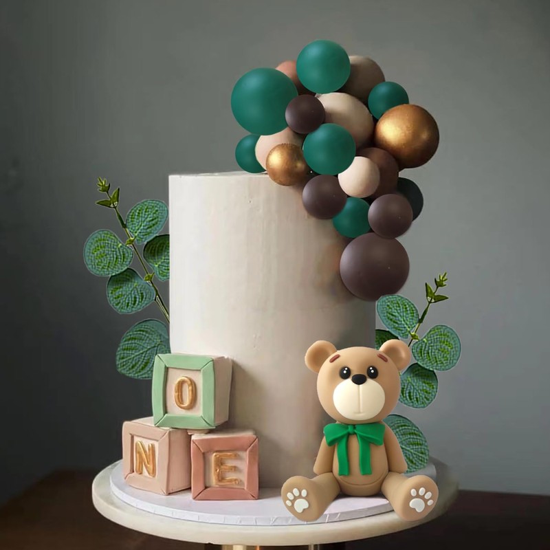 - Paquete: la decoración de pastel de oso incluye una decoración de pastel de oso, 2 hojas de eucalipto, 5 adornos de bolas doradas, 10 adornos de bolas verdes, 5 bolas caqui, 5 piezas de bolas marrones, un total de 28 piezas.