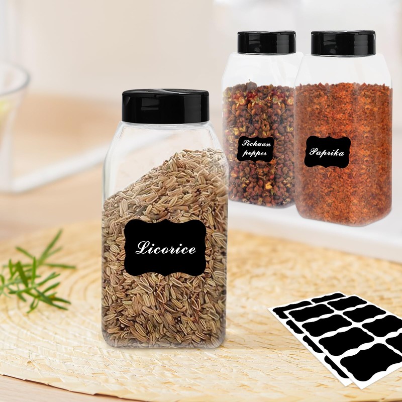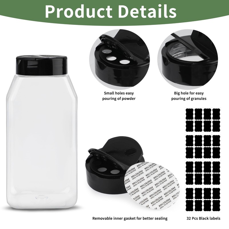 - Packaging Inclusions & Organization:28 pcs 16 oz square plastic spice jars with shaker lids arrive pre-loaded with 32 blank labels, enabling immediate spice cataloging. The coordinated black stickers maintain pantry aesthetics while preventing seasoning mix-ups during cooking.