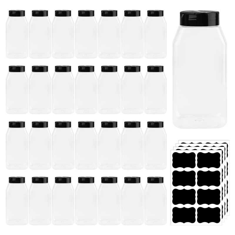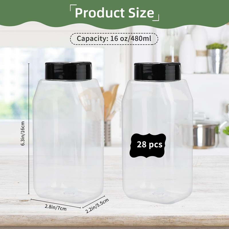 28 Pcs 16 oz Plastic Spice Jars with Black Cap,Square Plastic Bottle Containers with Lid and Stickers,Empty Seasoning Bottles Large Clear Spice Shaker for Storage Spices, Coffee, Tea, Herbs