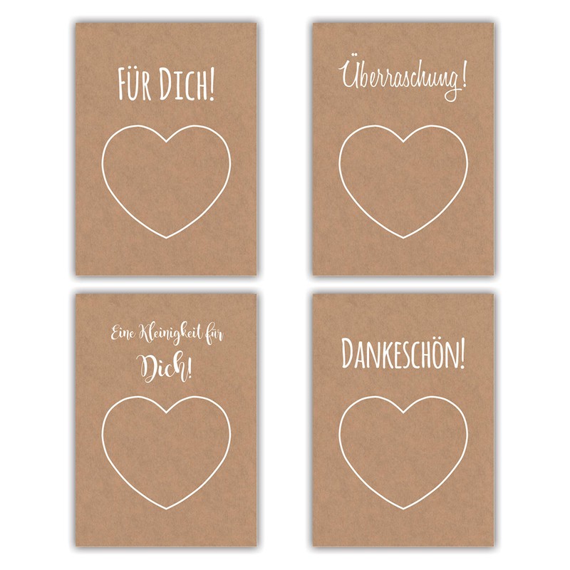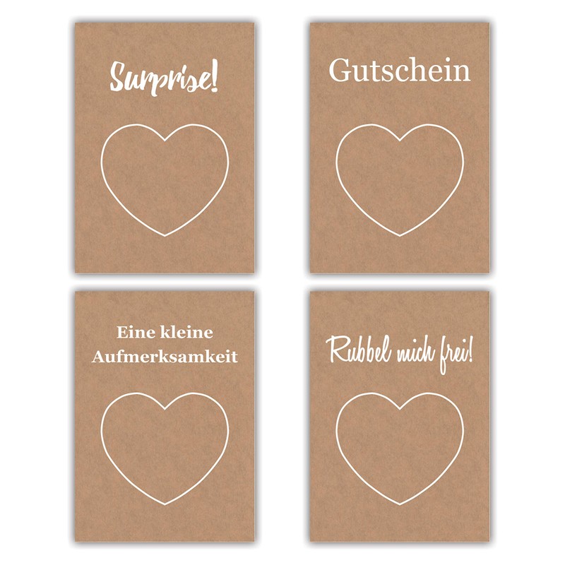 Write your text in the heart and stick it over with the enclosed stickers. The recipient can then scratch the heart and see his surprise.