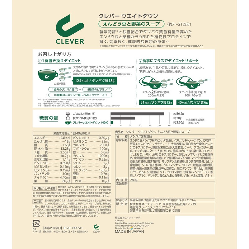 クレバー ウエイトダウン えんどう豆と野菜のスープ【減量するための植物性プロテイン】280g ピープロテイン 1食置き換え