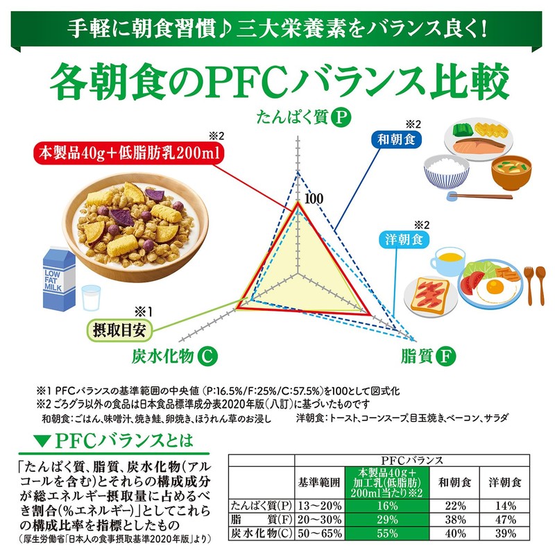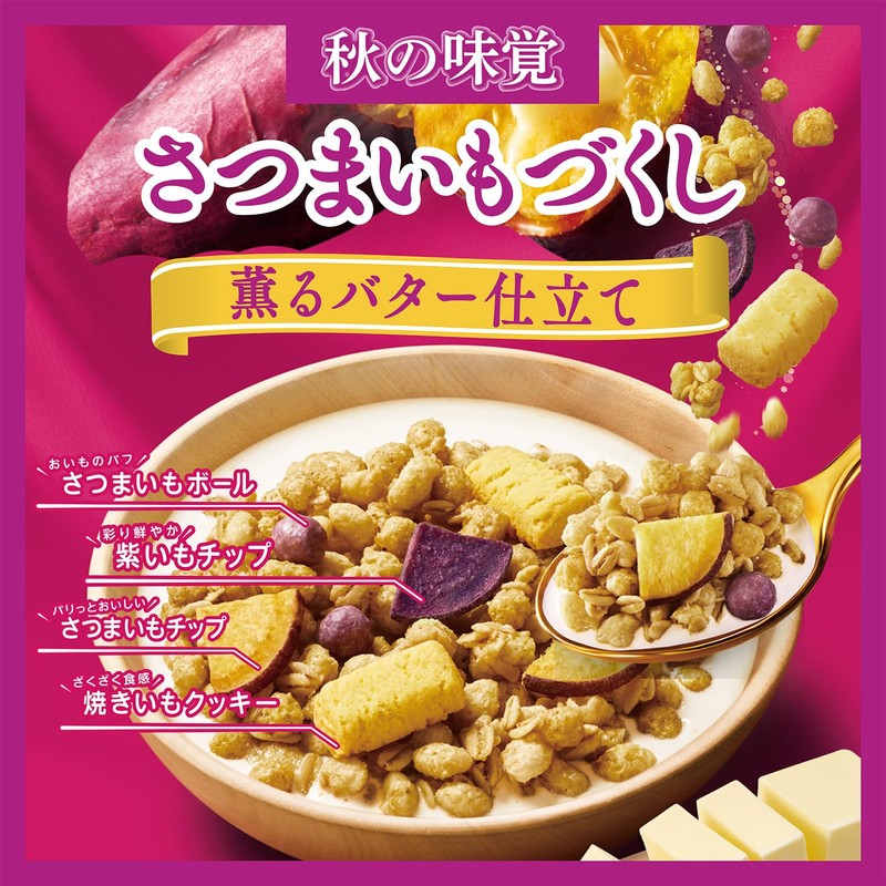 - 原材料 : オーツ麦フレーク(オーストラリア製造又はイギリス製造又はその他)、小麦シリアルパフ(大豆を含む)、ライ麦シリアルパフ(コーングリッツ、ライ麦粉、小麦粉、その他)、焼きいもクッキー(小麦粉、砂糖、ショートニング、でん粉、発酵バター、さつまいもパウダー、食塩)、砂糖、植物油脂、水溶性食物繊維、乾燥さつまいも加工品、デキストリン、乾燥紫いも加工品、さつまいもパフ加工品(砂糖、小麦粉、コーングリッツ、植物油脂、さつまいもパウダー、食塩)、乳糖、バター加工品(バター、牛乳)、さつまいもパウダー/炭酸カルシウム、香料、ビタミンC、乳化剤、着色料(クチナシ、フラボノイド、アントシアニン)、酸化防止剤(ビタミンE,ビタミンC)、ピロリン酸鉄、ナイアシン、カゼインNa、パントテン酸カルシウム、ビタミンB6、ビタミンB1、ビタミンB2、葉酸、ビタミンD、ビタミンB12