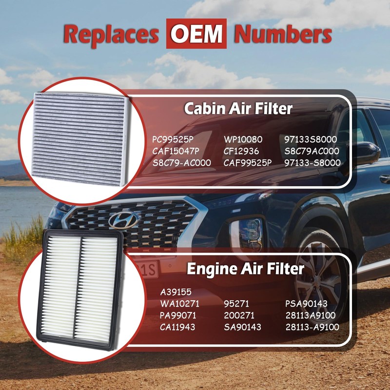 - 【Replaces OEM Numbers】 Engine Air Filter: 28113-A9100, 28113A9100, CA11943, PSA90143, WA10271, 95271, 200271, SA90143, PA99071, A39155. Cabin Air Filter: 97133-S8000, 97133S8000, PC99525P, CAF15047P, S8C79-AC000, S8C79AC000, CAF99525P, WP10080, CF12936.