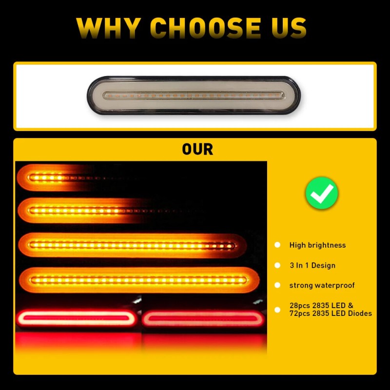 Features: *3-in-1 design: 3 In 1 Design,Neon Halo Ring Tail & Brake Light,Sequential Flowing Signal Light. *High brightness: The 2835 super bright LED with high brightness ensures its strong waterproof function and long service life,it is suitable for all outdoor inclement weather. *Waterproof: The tail light is highly silicon sealed with an IP67 waterproof rating, which works even under extreme conditions such as rain and snow. *Easy to install: Direct replacement,drilling and hardwiring are not required *Wide application: Fit for heavy-duty trucks, RV,semi-trailers, cargo trailers, boat trailers, work vehicles and a wide or narrow overland vehicle.