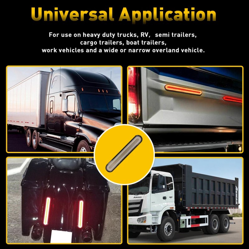 Specification Waterproof level: IP68 Voltage:12-24V LED Type:2835 SMD Light Color:Red+Yellow Material: PC+ABS Service life: 50000h+ Suitable: for use on heavy duty trucks, RV,semi-trailers, cargo trailers, boat trailers, work vehicles and a wide or narrow overland vehicle. Funciton: as clearance, side marker or identification light, stop, turn, tail and brake light Wire Connection: Black wire : negative Red wire : low brightness (red) White wire : high brightness(red) Yellow wire: dynamic light(yellow)
