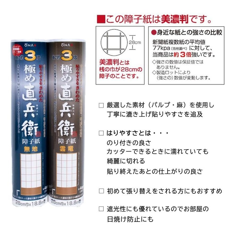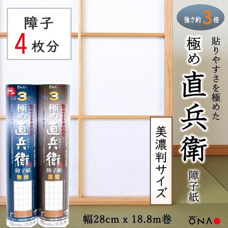 和紙屋の大直 極め直兵衛 貼りやすさをきわめた障子紙 美濃判 28cm×18.8m(4枚分) 強さ約3倍 無地 KN-128