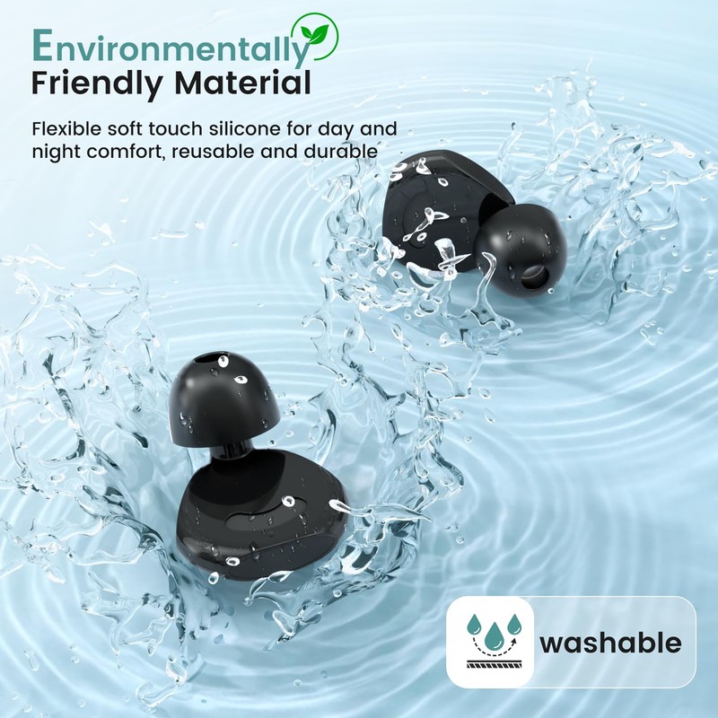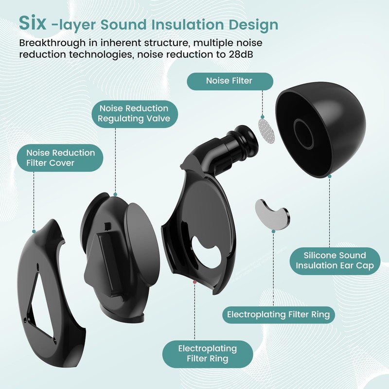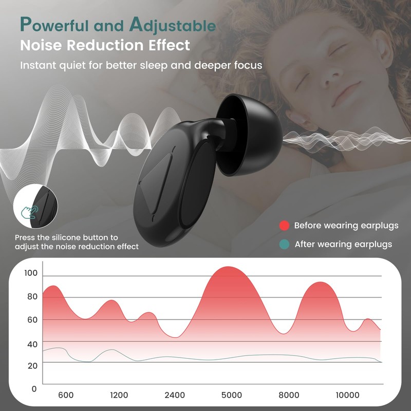 - 【POWERFUL SCIENTIFIC NOISE REDUCTION】This sleeping ear plugs adapts acoustic technology for powerful noise reduction, which can eliminate unnecessary noise comfortably and stylishly. Pressing the silicone button can adjust noise reduction effect, helping to improve sleep quality, deep concentration, stress-free travel, etc. With six layers of pure physical sound insulation noise reduction, the noise level is reduced to 28dB, which protects your ears from harmful sounds.