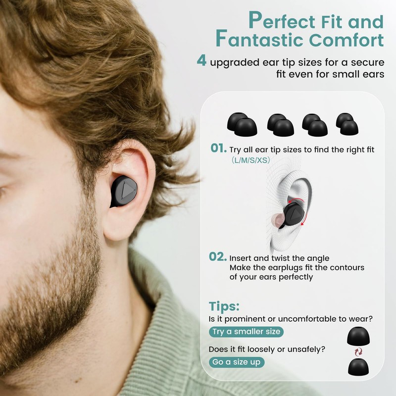 - 【ULTRA COMFORTABLE FIT】Our ear plugs combine ergonomic design with a 360° fit in the ear canal, more comfortable and pain-free to wear for long time. Made of lightweight and flexible silicone, these reusable earplugs prevent eardrum inflammation and provide fantastic comfort during the day and night even for side sleepers. Comes with 4 ear cap sizes (XS/S/M/L) to fit perfectly even for smaller ears. Please try them to get the right size for your ear canal for maximum noise blocking and comfort.