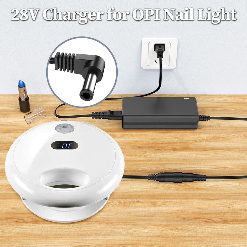 - Charger for Nail Light Specifications: Worldwide input voltage range: 100-240V 50/60HZ| Output: 28V 2A 56W (Compatible with 1.4A - 2A) | Power cord: 8.5FT/2.6M. The extremely long power cord is sufficient for indoor use