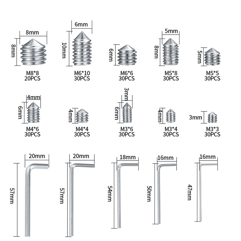 - 【What You Will Get】You will receive a total of 290 pcs mixed screws, in the size of: M3*3 mm, M3*4 mm, M3*6 mm, M4*4 mm, M4*6 mm, M5*5 mm, M5*8 mm, M6*6 mm, M6*10 mm, M8*8 mm, and 5 pcs wrench, which is enough for your daily use.