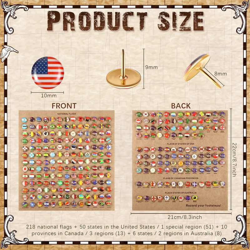 - Abundant Quantity: there will be 291 different flag map pins, including 218 national flags, 50 states flags and 1 territory flag in America, 10 Canadian provinces, 3 territory flags and 6 states flags, 2 territory flags of Australia; They will come with a 1.7 cm thick cork boards; The cork boards are printed with the corresponding national flag design of each country to let you know what the flag of each country looks like