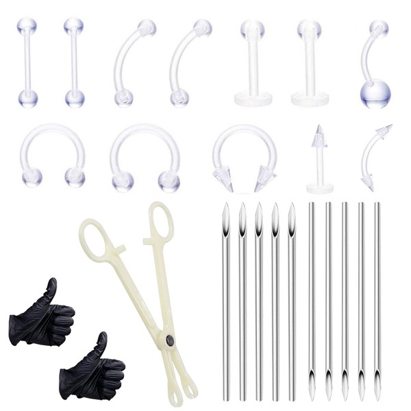 - ♕YOU WILL GET - The piercing kits contains 12 piece acrylic accessories items, 10 piece piercing needles, 4 disposable pads, a disposable puncture clip, and a pair of disposable gloves.