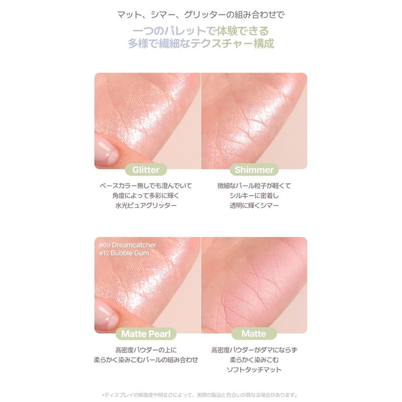 - Precautions when using: A) If the area used is exposed to direct sunlight and other abnormal symptoms or side effects such as red spots, swelling or itching, consult a physician, and B) Do not use for areas with injuries C) Precautions when storing and handling *Store away from direct sunlight, D) Do not rinse immediately when it gets in eyes, E) It's super sensitive to carmine ingredients. Those with symptoms or allergies Use with care (#01 Sunlite: Starlite, Apricot, Cam/#02 Fairy: Shinning, Mahogany/M3 Mistidia, Stelli Pink Antique Pink, Ash Fog/#04 New Day: Cocoa/M5 Diami: Cool Veil, Bailey, Mope Hazel, Taupe Colors) #07 Rubble: Moonlight, Moonsh, Rose Girl, Rust/# 08 Pink Boom: Kitty, Awake, Happiness #09 Dream Catcher: Berry Shower, Angel Tier, Silver Moon)