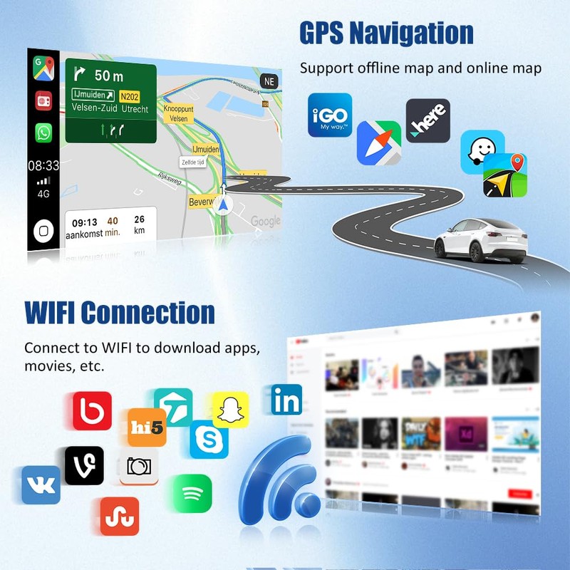 • 【Wired/Wireless Carplay & Andriod Auto】This android auto car radio is compatible with wired/wireless Carplay and Android Auto, support for Voice Control makes it easier to use phone functions, including music, GPS navigation, calls, notifications, messages and more, while keeping your hands free and completely safe of driving maneuvers