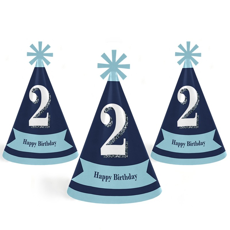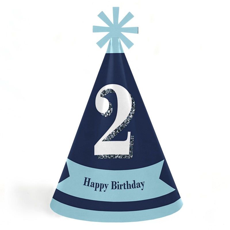 • 2nd Birthday Boy hats SIZE 8.5 inches tall and 5.5 inches in diameter at the base. The included elastic chin straps measure 12 inches long. Each of these fun blue and silver party hats feature a unique star cut-out decoration at the top and printed "Happy Birthday" on the front.