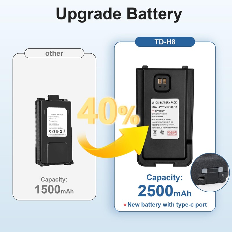 - 💎【2500 mAh Large Battery】 - 60h Standby Time. Compared with the traditional ham radio 1800mAh, the battery capacity of H8 is increased to 2500mAh, which is a 40% increase in capacity, and the standby time is more than 2 days.