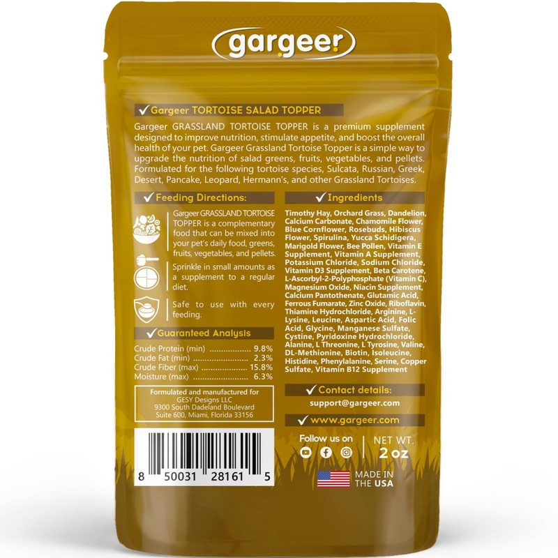 Specific Uses For Product:Gargeer Grassland Tortoise Topper is a premium supplement designed to improve nutrition, stimulate appetite, and boost the overall health of your pet. Gargeer Grassland Tortoise Topper is a simple way to upgrade the nutrition of salad greens, fruits, vegetables, and pellets. Formulated for the following tortoise species, Sulcata, Russian, Greek, Desert, Pancake, Leopard, Hermann’s, and other Grassland Tortoises., Salad Topper