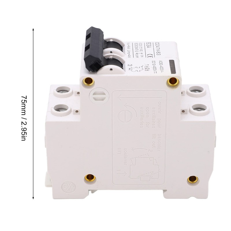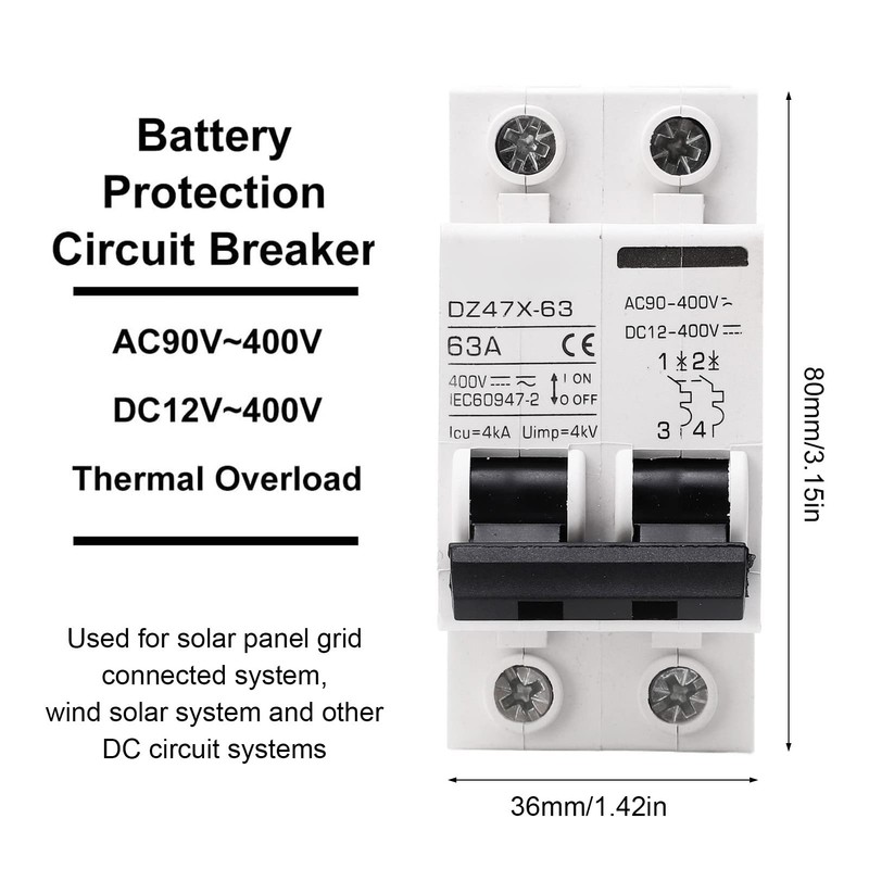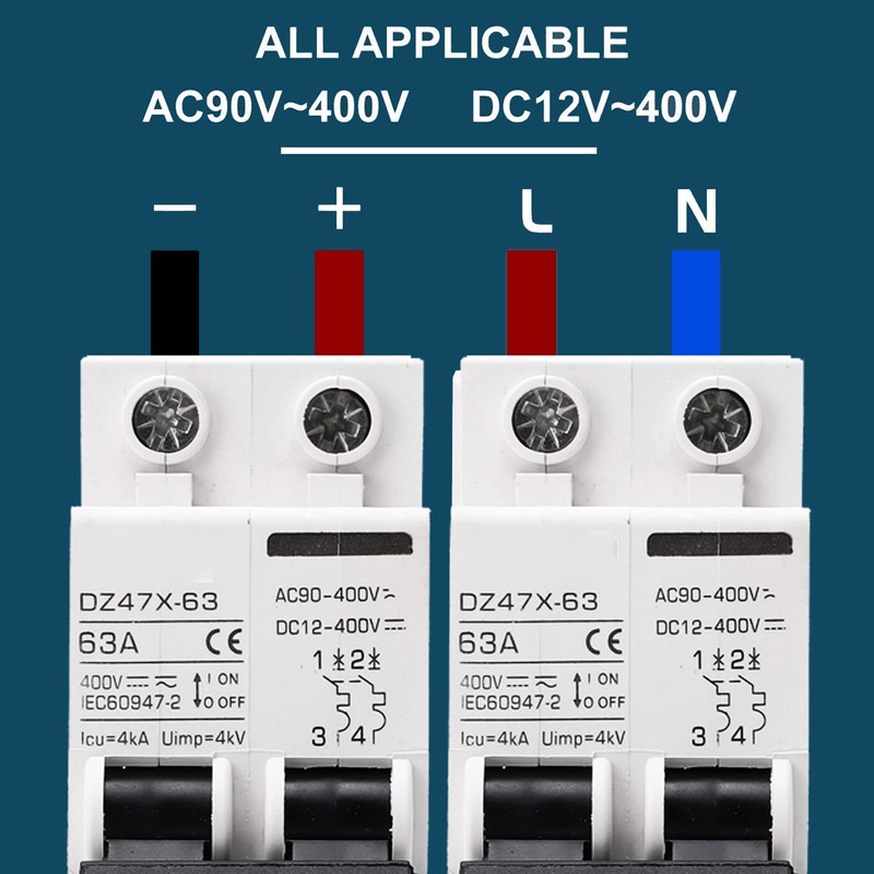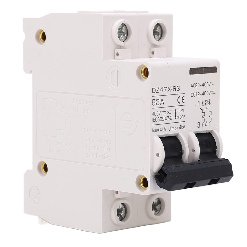 2P 63 Amp AC DC Miniature Circuit Breakers, DC 12-400V, AC 90-400V, Guide DIN Rail Mount Solar Disconnect Switch, Flame Retardant Circuit Breaker for Solar Panels Grid System