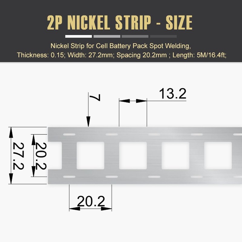 - 【SIZE】Nickel Strip for Cell Battery Pack Spot Welding, Thickness: 0.15; Width: 27.2mm; Spacing 20.2mm ; Length: 5M/16.4ft;
