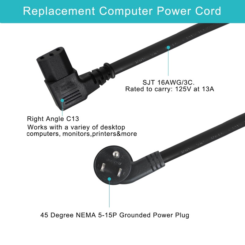 - 【PRODUCT SPECIFICATIONS】Package Include: 2PCS Universal Computer Monitor Power Cord; Length: 1FT; Connectors: 45-Degree NEMA 5-15P -Right Angle IEC C13, Wire Gauge: 16AWG. Rated to carry: 125V at 13A | 1625W.