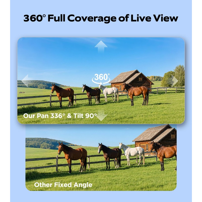 - 【360° Rotation Control & 2K Color Night Vision】This battery cellular security camera can be adjusted by the app's directional roulette wheel to pan 336° and tilt 90°, which can cover a wide 360° area to explore the nature as you like. This 4g cellular security camera is paired with a 3 megapixel lens to provide more vivid color wildlife moments at night, making it easy to see the nocturnal activities of animals on the ranch.