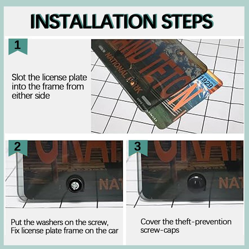• 【EASY TO INSTALL】-The license plate cover is easy to install ,each shield has four mounting holes, one in each corner.together with package:8 x theft-prevention screw-caps -8 x washers -8 x machine screw