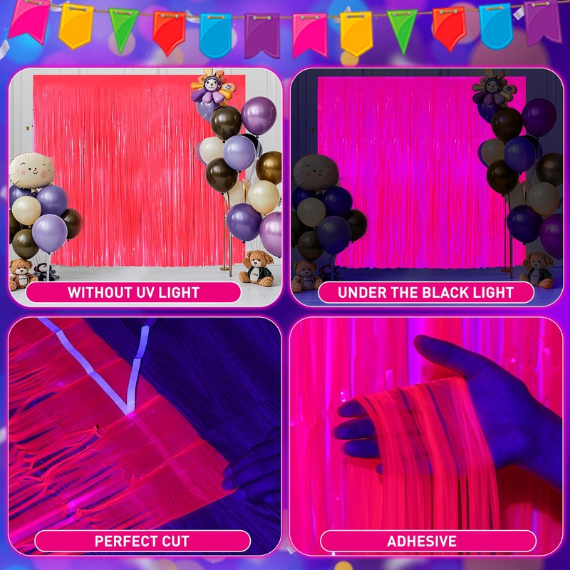 2Pack Glow in The Dark Foil Fringe Curtains, 6.6 x 6.6 ft Fluorescent Macaron Fuchsia Tinsel Backdrop, UV Reactive Neon Party Photo Booth Prop Streamers Birthday Wedding Blacklight Party Decorations
