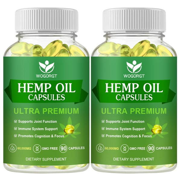 (2Pack) Hemp Oil Capsules - 60,000 Maximum Strength, Immune Support, Focus Calm, Relaxation, Mood, Rich in Omega 3, 6, 9 Fatty Acids - 90 Capsules