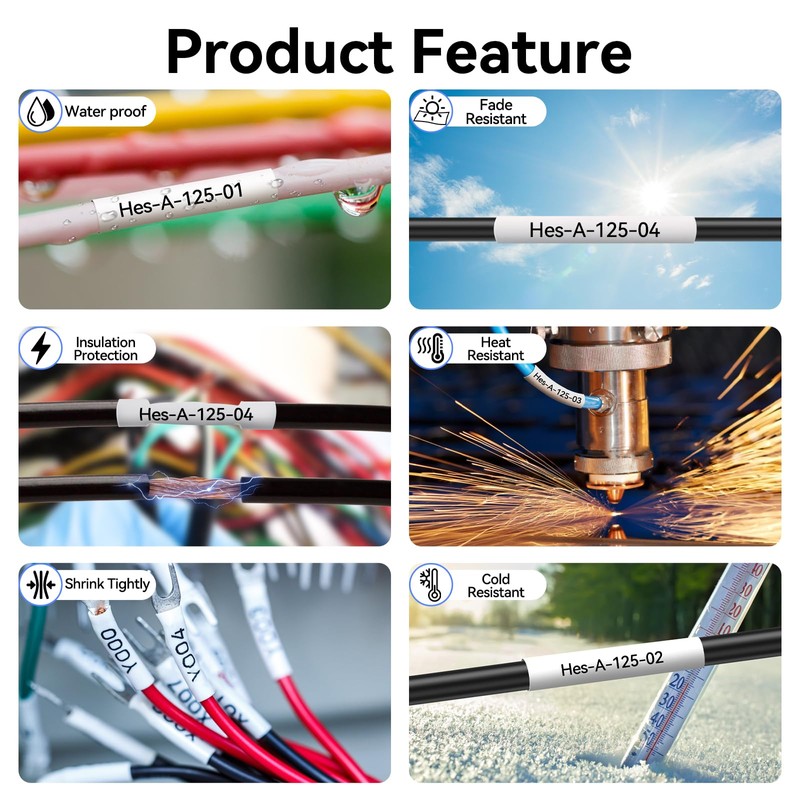 - 【👍Advantage】: UV-resistant, Cold/Heat-resistance, Fade-resistant, Waterproof, Rub-resistant. Heat shrinkable label has excellent flame retardant and insulating properties, very soft and elastic.