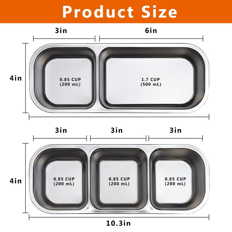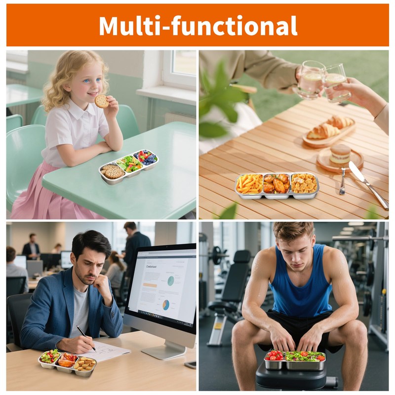 • Multipurpose:This three compartment stainless steel snack box is more than just for snacks,It’s also ideal for storing fruits, nuts, salad dressings, or even sauces,Use it to organize trail mix for road trips, portion yogurt and granola for breakfast, or even stash jewelry during travel. From office lunches to backyard BBQs, this container adapts to your life effortlessly