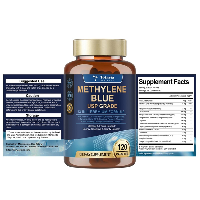 - 【Scientific Safe Ratio】12mg pharmaceutical grade methylene blue meets the low-dose safety range recommended by clinical studies (0.5-4mg/kg body weight). Vitamin C ester and Omega-3 are added to neutralize oxidative stress and improve the mildness of the formula.
