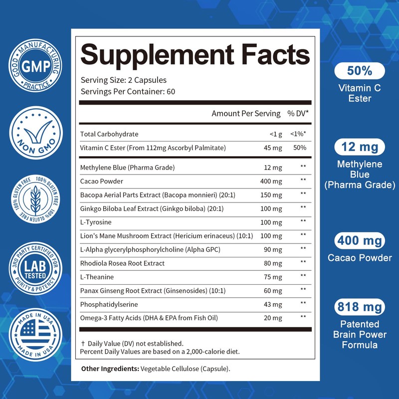 2Pack USP Methylene Blue Pharmaceutical Grade, 13 in 1 Upgrade Patented Brain Formula with Vitamin C Ester, Bacopa, Phosphatidylserine - Memory, Focus, Clarity, Cognitive, 240 Count