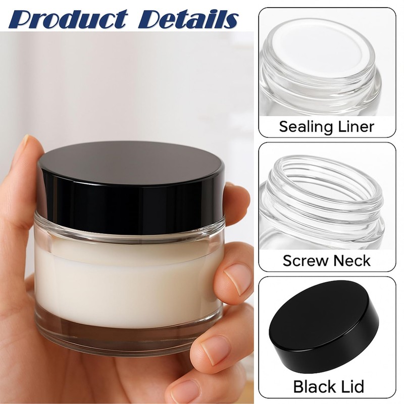- Leak-Proof Black Lid – The empty glass jar with lid features a tight-sealing screw top plastic lid and inner liner to prevent leaks, spills, keeping your skincare products fresh and secure.