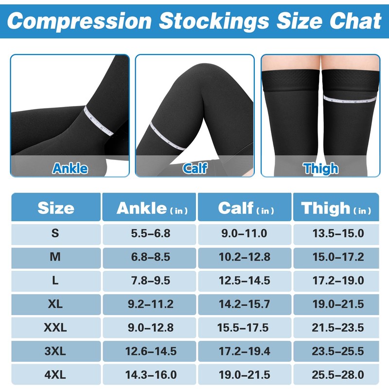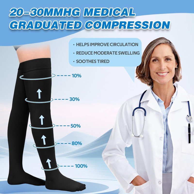 - GRADUARED COMPRESSION: These compression stockings for women are progressive compression of 20-30 mmHg with a gradual reduction in the pressure level from the ankle to the thigh. This design can ensure effective compression without making your thighs feel too tight, helping to reduce pressure on your legs and relieve pain.