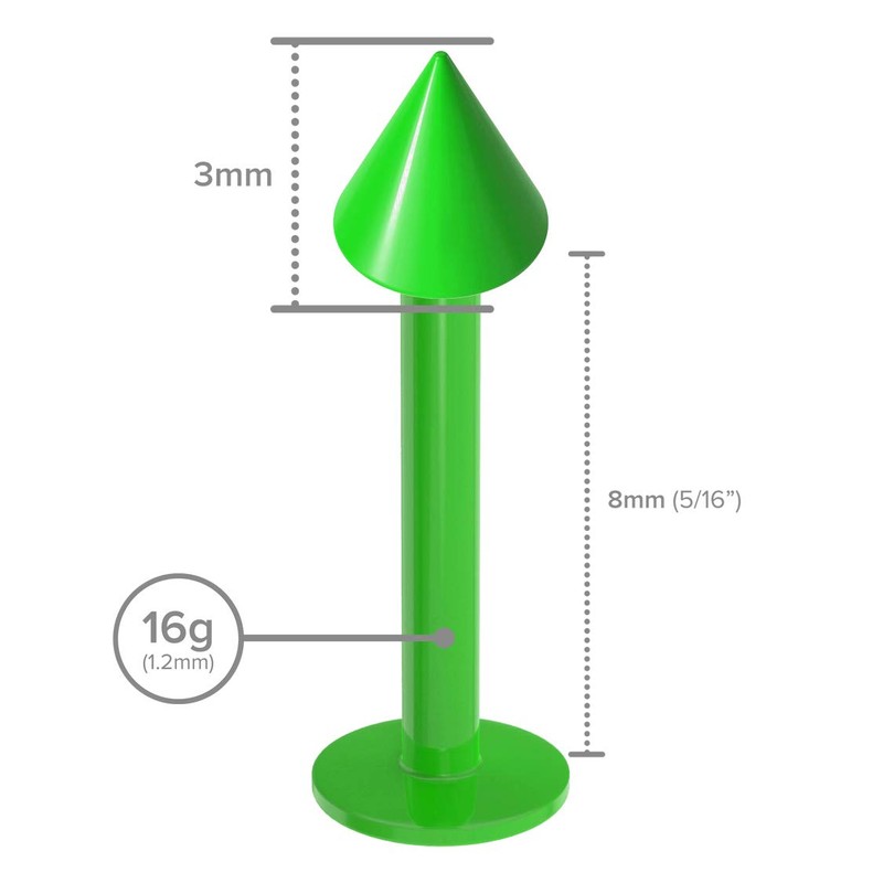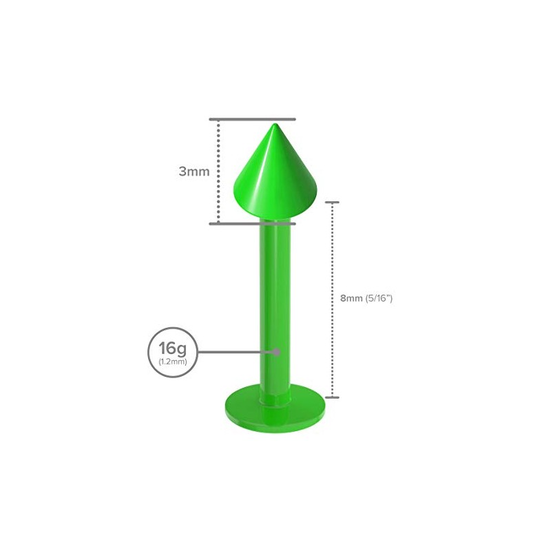• SPECIFICATIONS - Length: 8mm. Gauge: 16g. Color: green. Ball End: Cone 3mm. These lip studs piercings are designed and tested for quality. Get the most out of your piercing with these lip rings jewelry