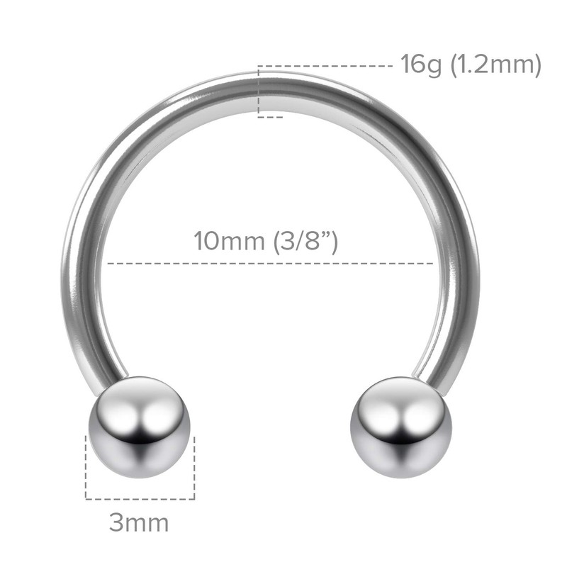 - SPECIFICATIONS - The internal diameter of these circular barbell 16g 10mm is: 10mm - 3/8". Gauge: 16g - 1.2mm. Ball End: 3mm ball. These horseshoe earrings for men are designed and tested for quality. Get the most out of your piercing with these mens hors