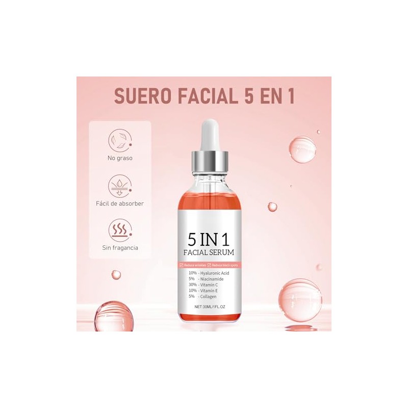 Acerca de este artículo Fórmula 5 en 1: contiene 10 % de ácido hialurónico para hidratar y dar volumen a la piel, 5 % de niacinamida para reducir la aparición de imperfecciones, 30 % de vitamina C para iluminar la piel, 10 % de vitamina E para protección antioxidante y 5 % de colágeno para reafirmar y aportar elasticidad Potente fórmula antienvejecimiento: diseñado para combatir los signos del envejecimiento, el suero facial 5 en 1 presenta una fórmula poderosa que promueve drásticamente una piel más suave y de aspecto más juvenil con el uso continuo PLANTAS NATURALES: El suero facial 5 en 1 contiene ingredientes activos de origen vegetal como vitamina C, niacinamida, ácido hialurónico y vitamina E.