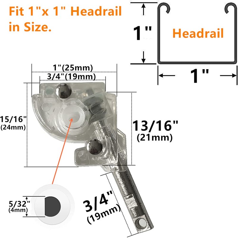 • Package of 2pcs wand tilt mechanism used For aluminum or vinyl mini blinds with measure 1" x 1" headrail and have a 5/32" D-shaped tilt rod.