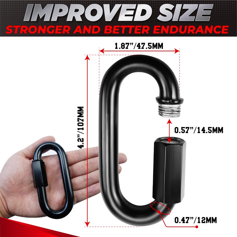- 2500 LBS MAXIMUM WEIGHT BEARING: Our quick links have a boasting thickness of 12mm and are precisely 4.2 inches long, making the impressive weight-bearing capacity of up to 2500 LBS, ensuring maximum stability and strength, giving an ideal quick link to meet any heavy-duty needs.