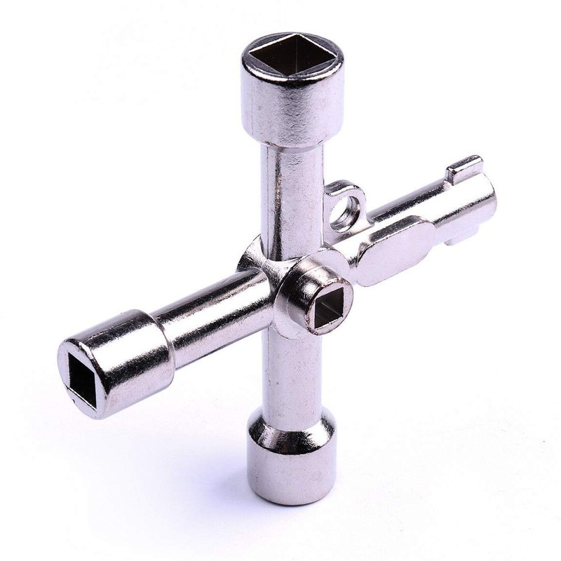 - 4 way Plumbing and Utility Key Includes: 15/64 inch female square key, 5/16 inch female square key, 3/8 inch (side dimension) female triangle key, and a double sided skeleton key