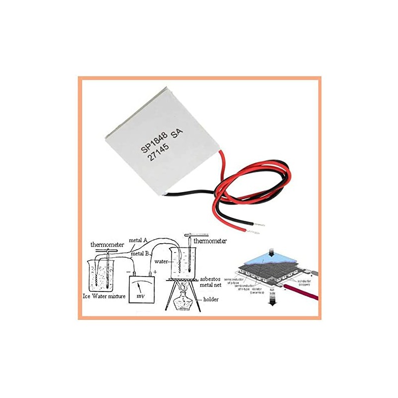 Lead Length: about 30cm Thermal conductivity (K): 15~16x10-3-W/Celsius cm value (Z): 2.5 ~ 3x10-3W/Celsius Thermoelectric parameter:Conductivity: 850~1250ohm -1.cm-1 Temperature electromotive force (a):190x uV/ Celsius Working Environment: -60~125Celsius Size: 4x4x0.34cm/1.57x1.57x0.13inch Product structure and composition Single-layer double-sided ceramic packaging structure The package is 704 silica gelInside is a semiconductor material made of bismuth telluride (Bi2Te3) Soldering agent is low temperature solder (Tin-Bismuth Alloy) 100% new and high quality. Colour:White Material:Bismuth telluride Package Contents: 2 x SP1848-27145 Peltier TEG Module Only the above package content, other products are not included. Note: Light and different displays may cause the color of the item in the picture a little different from the real thing. The measurement allowed error is +/- 1-3cm.