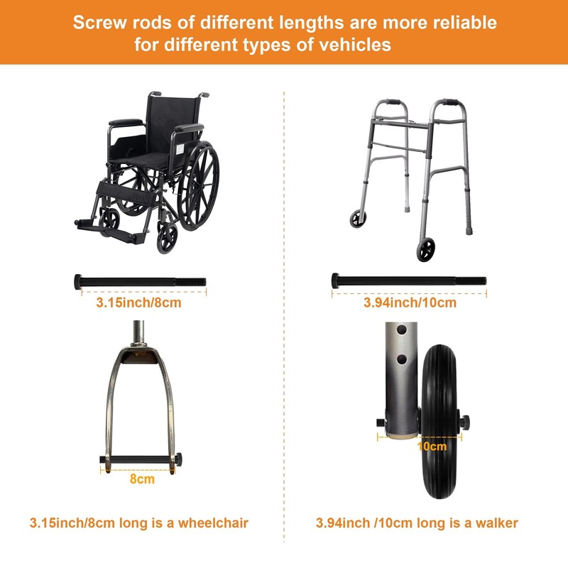 - High strength: Please confirm the product size specifications before purchasing. In order to increase strength and extend service life, this product uses widened wheels and 8.8 grade high-strength screws, with a wheel width of 1.4 inches.With high-quality casters and metal ball bearings, these replacement wheels are built to last. The ABS wheels have a strong load-bearing capacity, making them perfect for wheelchair assist devices and rollators.